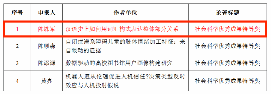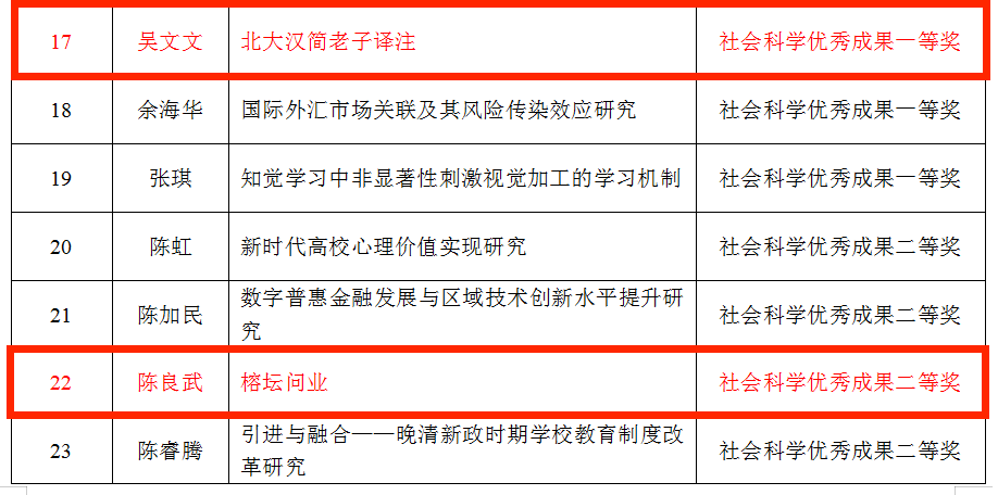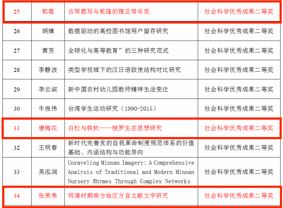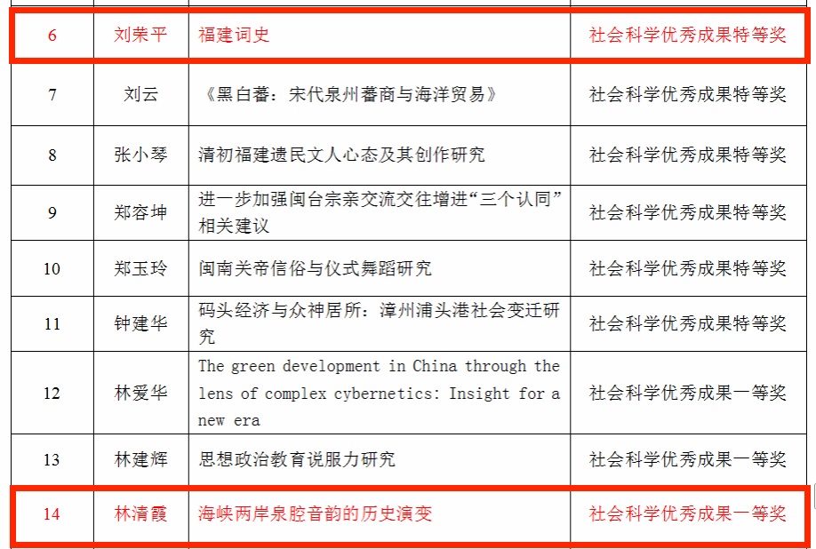 陈练军教授的《汉语史上如何用词汇构式表达整体部分关系》获社会科学优秀成果特等奖;刘荣平教授的《福建词史》获社会科学优秀成果特等奖;林清霞老师的《海峡两岸泉腔音韵的历史演变》获社会科学优秀成果一等奖;吴文文教授的《北大汉简老子译注》获社会科学优秀成果一等奖;陈良武教授的《榕坛问业》获社会科学优秀成果二等奖;郭薇老师的《古琴题写与乾隆的雅正琴乐观》获社会科学优秀成果二等奖;唐梅花副教授的《白松与铁轨——梭罗生态思想研究》获社会科学优秀成果二等奖;张荣荣教授的《明清时期南方地区方言文献文字研究》获社会科学优秀成果二等奖。