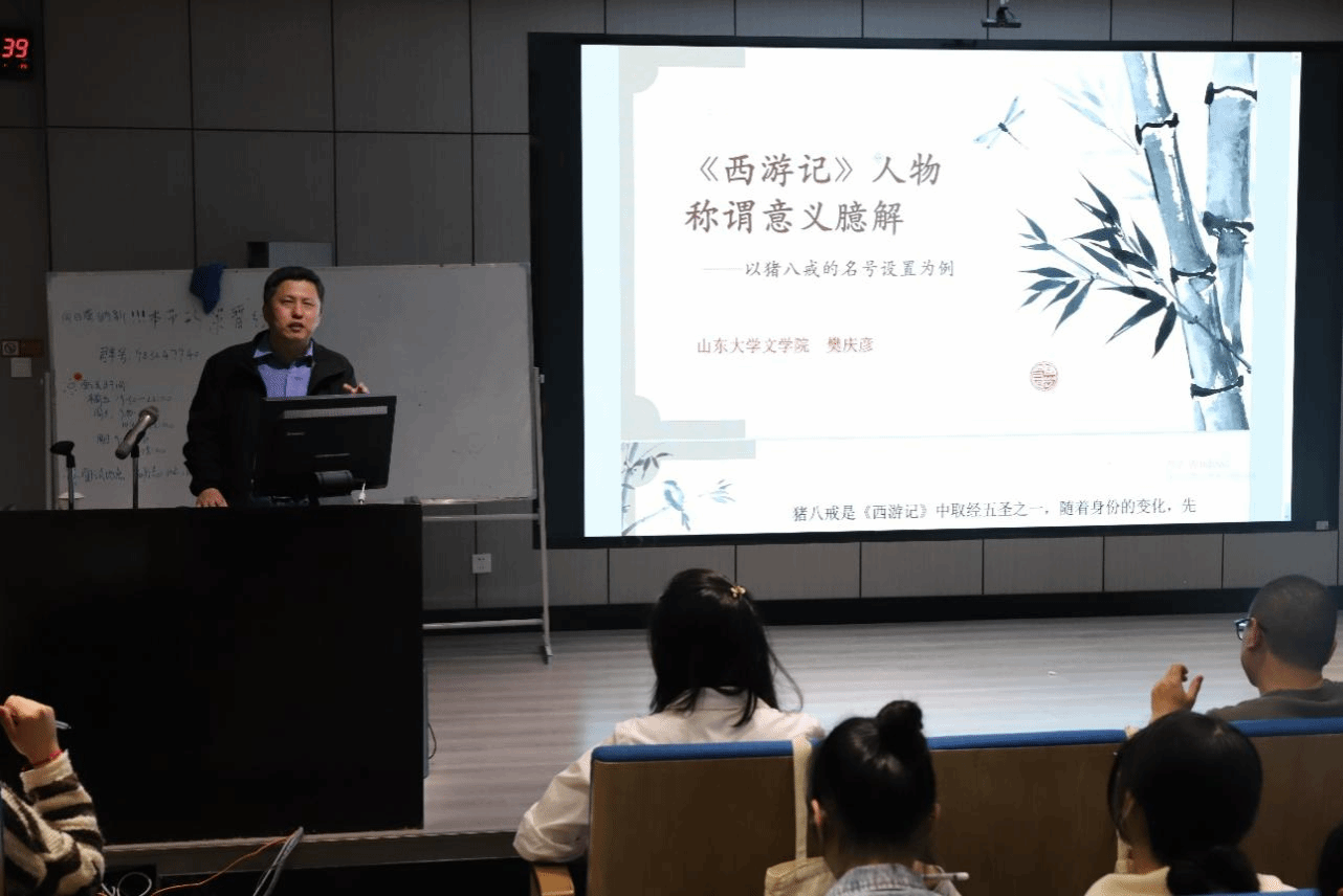 讲座中,樊庆彦以猪八戒五次名号变迁为切入点,层层解码明代思想史与文学叙事的隐秘对话。讲座创新性建构了四维解析框架:一是三教合流的思想镜像,揭示嘉靖年间"三教合一"政策对角色设定的深刻影响;二是反讽修辞的艺术张力,剖析"天蓬元帅"等称谓在喜剧外壳下的社会批判意识;三是心学脉络的叙事编码,论证名号演变暗含"放心→收心→定心→正心"的阳明心学实践路径;四是人性书写的现代启示,重估作者对人性欲望的辩证认知,提出"吴承恩的宽容远超时代"新见。他特别强调:"五个名号犹如五面棱镜,既折射明代思想光谱,又照见永恒的人性博弈。"现场师生通过文本细读发现,猪八戒"贪吃"特质背后,竟暗藏对商品经济萌芽的文学回应。