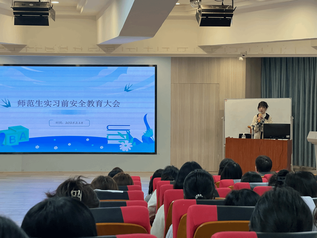 随后,肖模艳就师范生实习前的安全教育作了详细说明。她首先介绍了实习进校的具体安排,并重点强调了实习期间的安全注意事项,包括人身财产安全、交通安全、教学工作安全及网络信息安全。此外,她还详细讲解了实习任务,提醒同学们在实习期间要树立“口碑意识”,正确认识“边界”,努力提升自身综合素质。最后,她对实习成绩评定的相关要求作了说明,鼓励同学们以积极的态度迎接挑战,圆满完成实习任务。