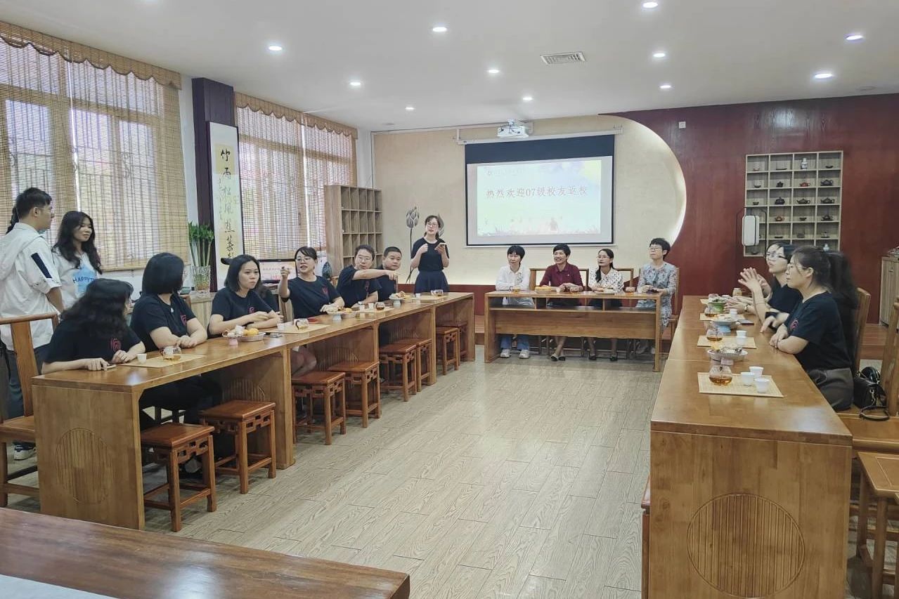 后,校友们满怀激动,于博东中庭合影留念,为本次聚会留下美好记忆。随后,校友们与学院领导一同进入博东114海峡茶文化课堂开展座谈会。