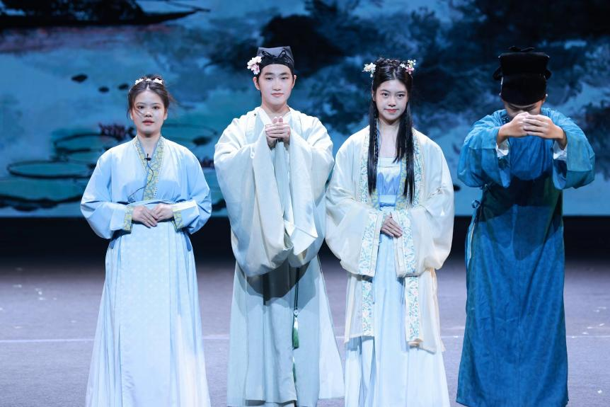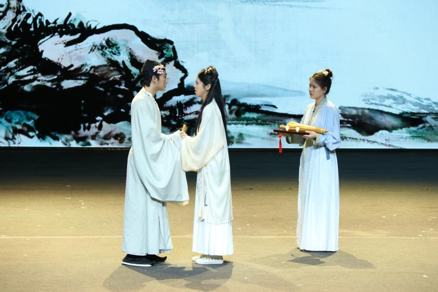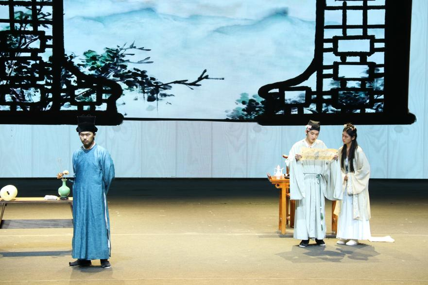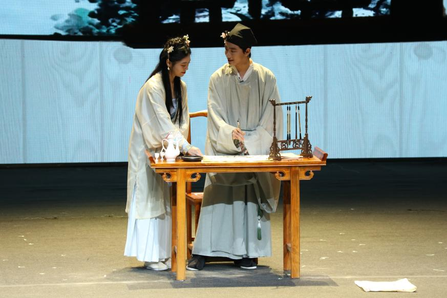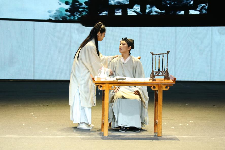 课本剧专场的舞台上,我对柳永及其词作有了再认识。剧中,柳永与虫娘缠绵悱恻的爱情令我动容,柳永看似妥协但迂回着向天命宣告不屈、寻觅本心,他在框定的社会主流价值观与个人时运意趣之间挣扎更叩震着我的心。同时,配乐造景、演员演技、灯光人声、语言服饰等方面皆可圈可点,各方面配合使该剧充满张力与悲剧色彩。