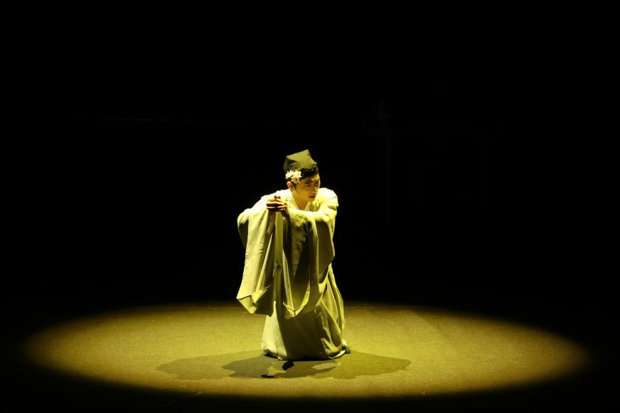 此剧仅用寥寥数个人物演绎故事,在角色设置方面有所取舍,以少胜多。除了船夫形象的简化,金殿黜落一幕也未将皇帝具象化,而是采用画外音。饰演柳永的演员跪对观众,向上而揖,与皇帝对话,营构出“高皇帝,在九京”之味,正是一句明褒暗贬的“且去填词”顷刻间断送了柳永的青云路。谁解寒窗意,沥血已惘然。