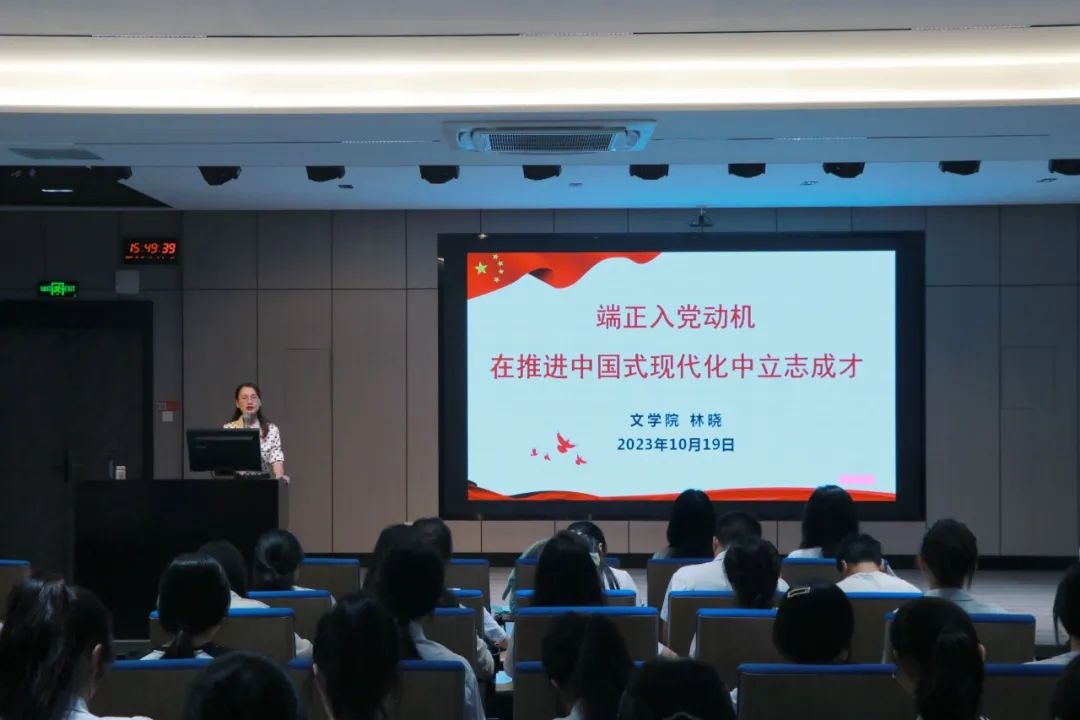 开班仪式后,林晓以《端正入党动机,在推进中国式现代化中立志成才》为题为本期学员讲授第一堂党课。她结合四问,即“什么是入党动机”“为什么要端正入党动机”“如何树立正确的入党动机”“怎样把入党动机转化为实际行动”展开论述,从分析大学生中存在的几种不正确的入党动机入手,指出入党动机是一个人要求入党的内在原因和真实目的,是推动其争取入党的精神力量,每一名追求入党的积极分子都要时刻提醒自己,入党是为了什么,入党以后要干什么,严格以党员标准要求自己,不仅在组织上入党,更要在思想上入党,早日成为一名合格的共产党员。课上,她立足推进中国式现代化的时代背景,向学员们详细讲解了中国式现代化的丰富内涵和本质要求,指出新时代青年是探索实现中国式现代化的实践主体与先锋力量,勉励学员们切实把入党动机转化为推进中国式现代化的火热实践,要坚定理想信念,以更加强烈的历史主动精神助力实现中国式现代化,要不断提高自己的政治素养、思想水平及专业素质,始终保持着自强不息、充满活力的朝气,在思想、学习、工作和生活上始终发挥先锋模范作用,立志做有理想、敢担当、能吃苦、肯奋斗的新时代好青年。