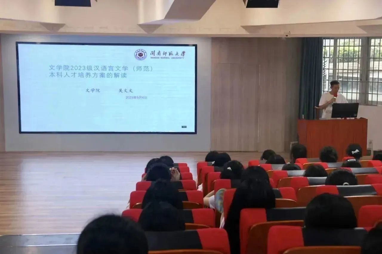 为使2023级新生能够更好地明确大学生活的目标和定位,适应新环境,做好迎接多彩的大学生生活的准备,9月6日,汉语言文学专业负责人林颂育、汉语言文学(师范)专业负责人吴文文、汉语国际教育系主任陈瑞松分别在博东606、博西梯一和博东609开展了本科人才培养方案解读大会,全体23级本科新生到场参加。