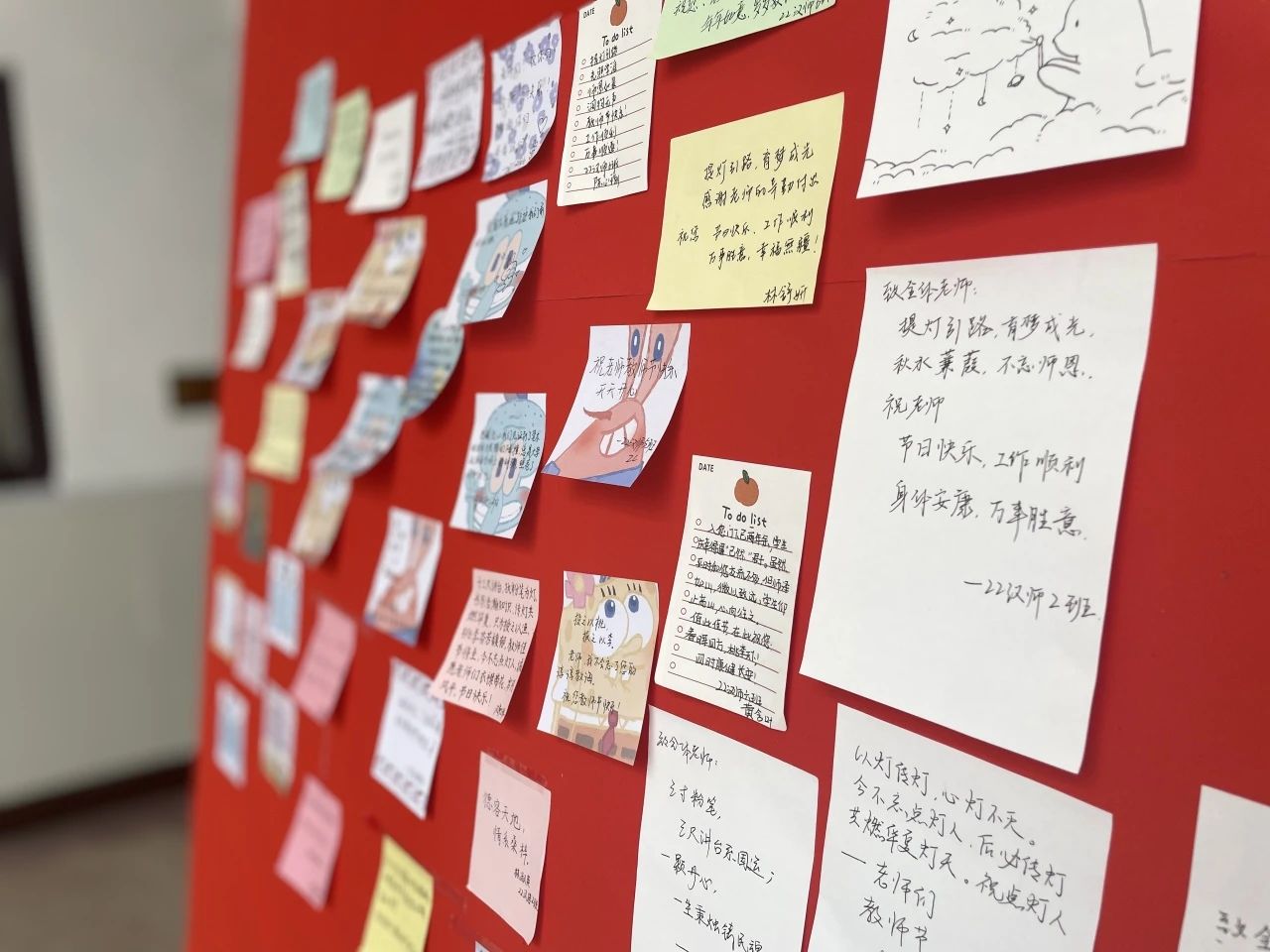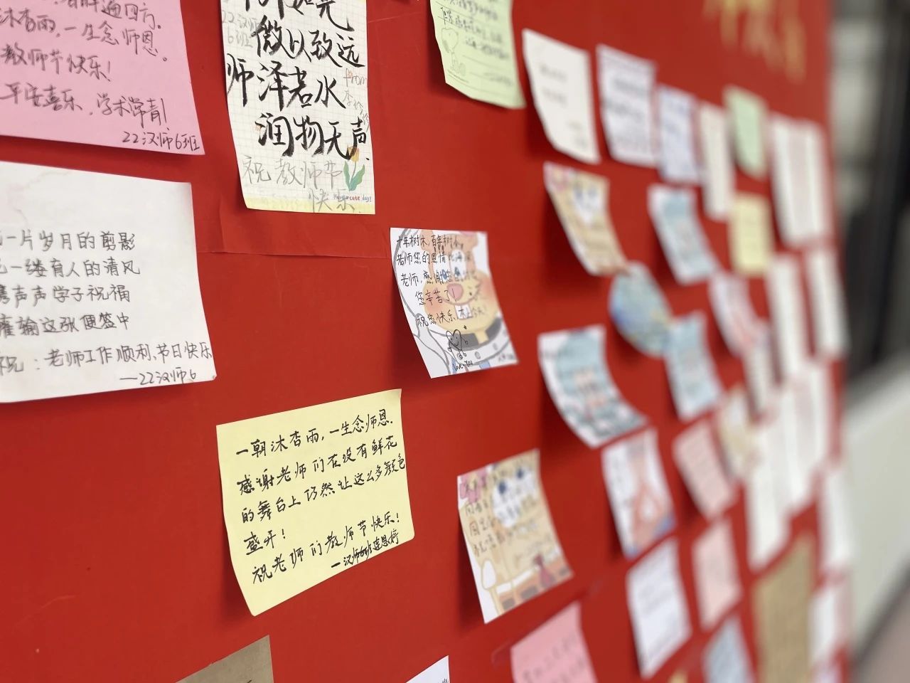 日暖风和绽桃李,笔酣墨浓写春秋。为了表达对老师的美好祝福,此次活动于博东一楼设立了教师节表白墙,同学们用便利贴一起为老师们留言送祝福。