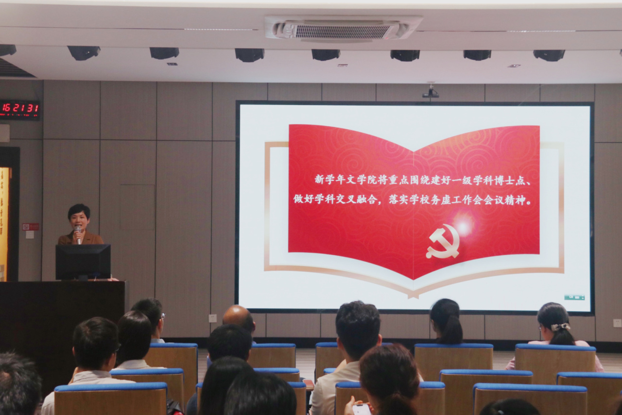 赵丽霞书记传达学校务虚工作会议精神,讲述听取专家报告的心得体会,重点传达李顺兴校长和吴彬镪书记的讲话精神,赵丽霞指出,要坚决落实常斌副省长关于“建好中国语言文学一级学科博士点”的指示精神,落实学校务虚工作会会议精神,推动学院各项工作再上新台阶、再创新辉煌。