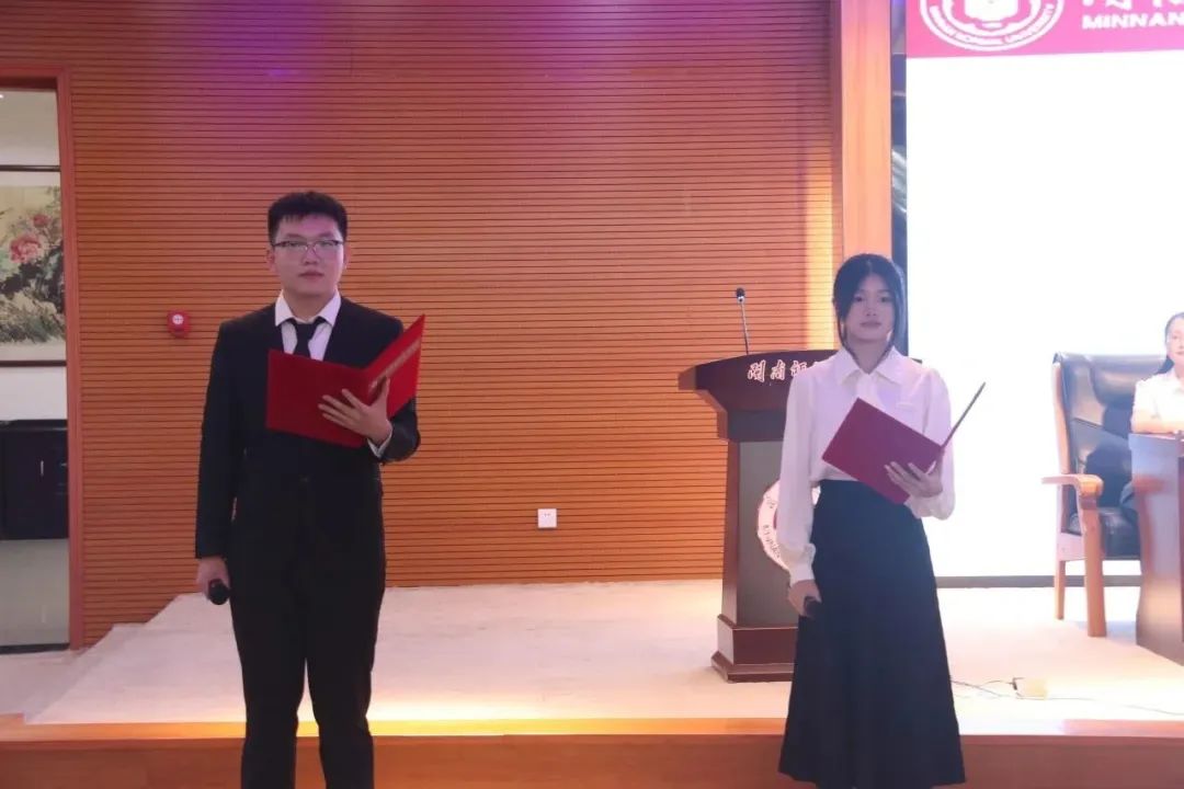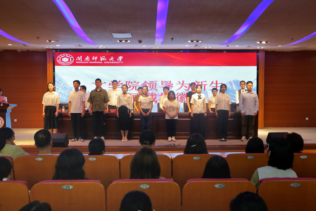 典礼下半场,学院领导为新生代表佩戴校徽,校徽不仅代表着“闽南师大人”这一光荣的身份,更承载着闽南师大人的初心和使命,饱含着学校对师生的祝福与期望。