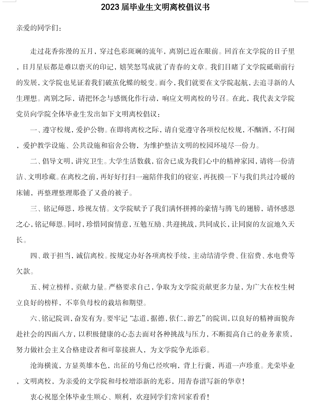 学生第三党支部蓝欣代表毕业生党员向全体毕业生发出《文明离校倡议书》,倡议毕业生党员在离校之际发挥先锋模范作用,“站好最后一班岗”,号召全体毕业生遵守学校规章制度,谨怀感恩之心,铭记院训,奋发有为,光荣毕业,文明离校。