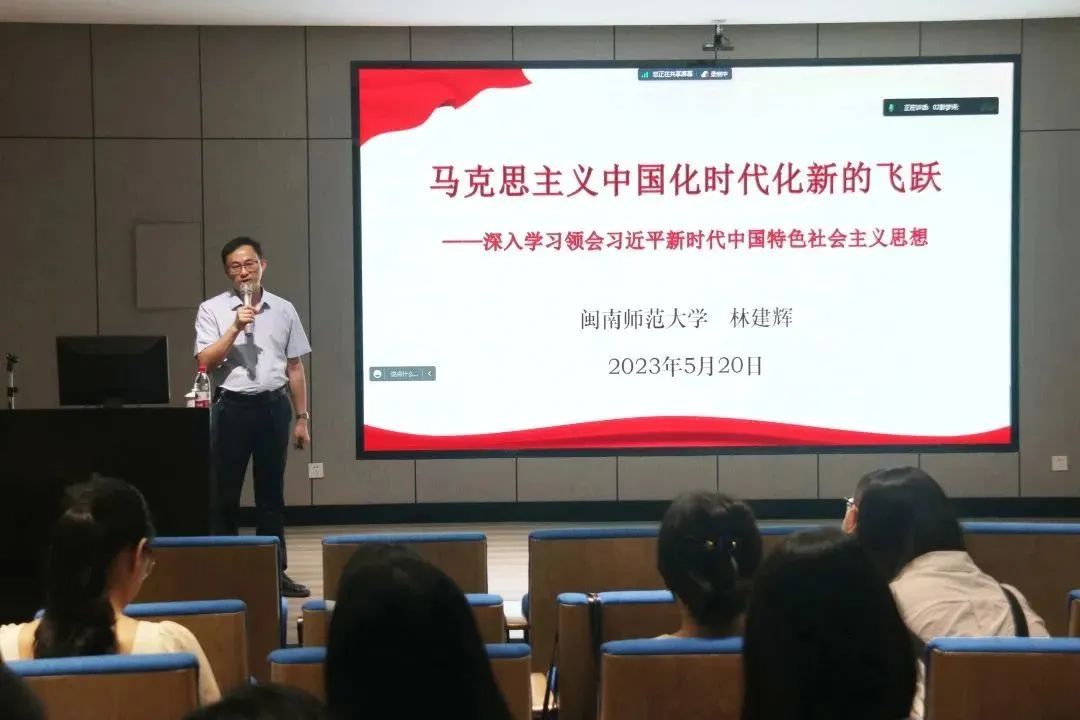 紧接着,林建辉对深入学习领会习近平新时代中国特色社会主义思想做出重点阐述,总结新时代所具有的历史性、实践性、人民性、民族性和世界性等五个特征。并回顾了新时代十年的举措和成就,强调推动马克思主义中国化时代化,应从中国实际出发,要坚持把马克思主义基本原理同中国具体实践相结合、同中华优秀传统文化相结合,用马克思主义观察时代、把握时代。他指出,要从道路、国家和政党三大维度了解习近平新时代中国特色社会主义思想的时代课题,注重理论学习,掌握“十个明确”“十四个坚持”“十三个方面成就”,深入学习中国特色社会主义理论体系。