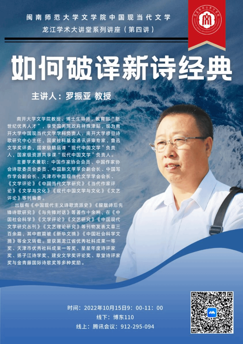 ,系教育部“新世纪优秀人才”,享受国务院政府特殊津贴,现为南开大学中国现当代文学学科负责人,南开大学穆旦诗歌研究中心主任,国家社科基金通讯评审专家,鲁迅文学奖评委,国家级精品课“现代中国文学”负责人,国家级资源共享课“现代中国文学”负责人。主要学术兼职:中国作家协会会员、中国作家协会诗歌委员会委员、中国新文学学会副会长、中国写作学会副会长、天津市中国现当代文学学会会长、《文学评论》《中国当代文学研究》《当代作家评论》《文学与文化》《现代中国文学与文化》《文艺评论》等刊编委。出版有《中国现代主义诗歌流派史》《与先锋对话》等著作十余种。在《中国社会科学》《文学评论》《文艺研究》《中国现代文学研究丛刊》《文艺理论研究》等刊物发表文章三百余篇,其中数篇被《新华文摘》《中国社会科学文摘》等全文转载。曾获黑龙江省优秀社科成果一等奖、天津市优秀社科成果一等奖、星星年度诗评家奖、扬子江诗学奖、建安文学奖评论奖、草堂诗评家奖与金青藤国际诗歌奖等多种奖励。本次讲座为线上线下同步举行,吸引了南开大学、武汉大学、大连理工大学、黑龙江大学、广西民族大学、大连外国语大学、天津外国语大学、贵州财经大学等兄弟院校师生的广泛关注,据统计,共计200余人线上出席了本次讲座。