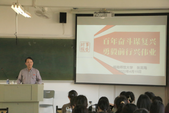 此次讲座以“立足百年大党新起点,接力百年奋斗新征程”为主题,内容涵盖镌刻史册的伟大飞跃不可逆转的复兴进程、气象万千的伟大时代浓墨重彩的崭新篇章、永葆初心的大党担当伟大光荣的历史贡献、弥足珍贵的精神财富开创未来的行动指南四大板块。首先,张龙海教授详细介绍我国新民主主义革命时期、社会主义革命和建设时期、改革开放和社会主义现代化建设时期及新时代中国特色社会主义新时代所创造的伟大成就,并指出中华民族从站起来、富起来到强起来的这一伟大飞跃离不开中国共产党的正确领导及全国人民的共同奋斗,通过对历史的梳理,并且以视频的方式更加深化了我们的党史理论学习教育。紧接着,张龙海从时代发展的角度出发,讲述中国新时代的历史性成就和历史性变革,为我们进行了细致的分析与讲解,强调了在新时代“两个结合”、“十个明确”、“两个确立”的重要性。随后,张龙海谈论到党的初心与党的百年奋斗历史贡献,以先进人物事迹为例阐述党员的理想信念是共产党员立身安命的根本,艰苦奋斗的精神是共产党员的政治本色,自我革新是共产党员的传统品质,不忘初心是共产党员庄严使命。最后,他以“十个坚持”紧扣主题,指出我们要以史为鉴开创未来,并且推荐了有关传递中央精神的篇目并与我们共同探讨了相关问题,对同学们提出的问题进行了详细解答。张龙海指出,百年风雨波澜壮阔,只有不忘初心才能砥砺前行,传递中央精神,纵论天下大势。