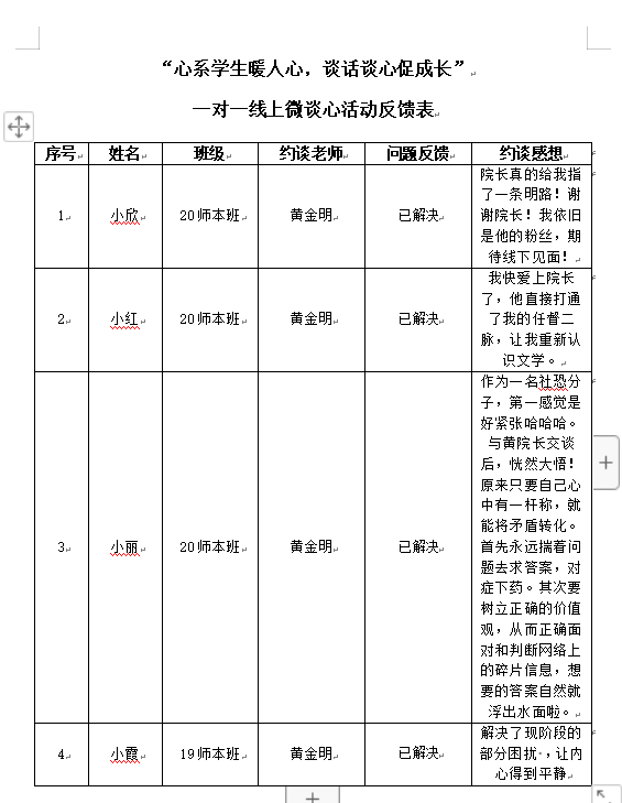此次谈心活动有效地解决了学生在学习生活上的问题,加深了师生之间的密切联系,拉近了师生之间的距离,为学院在疫情防控新形势下各项教学工作和学生工作的深入开展提供新思路。