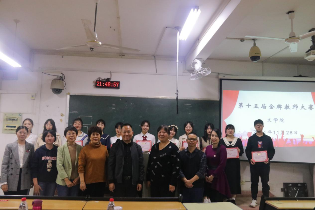 语文教育教研室、省赛指导老师刘闽彦等四名老师担任评委。学院党委副书记谢斌斌、副院长杨杏红、外国文学与文艺理论教研室主任唐梅花、团委负责人许新华到场参加。