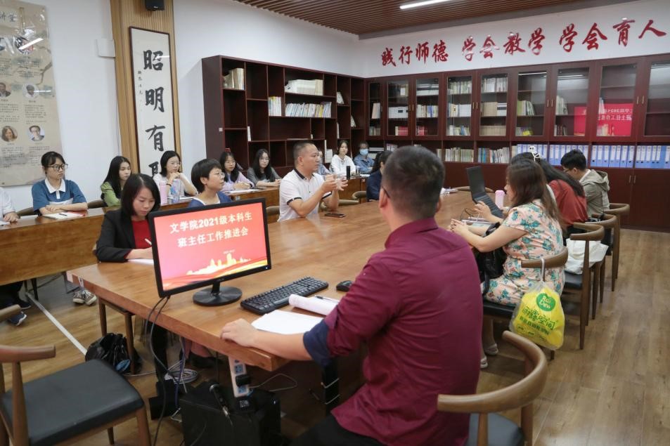 于博东110举行2021级本科生班主任工作推进会。学院党委副书记谢斌斌,副院长杨杏红,各班班主任以及2021级各班班长、团支书参加会议。会议由辅导员林小沛主持。