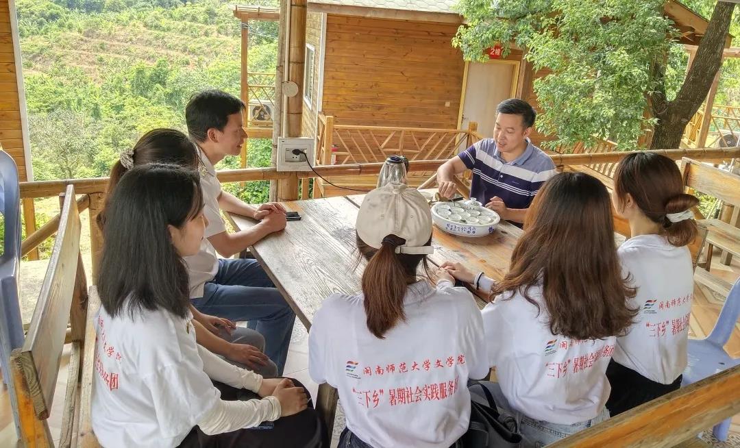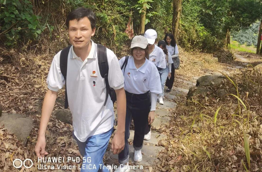 实践队成员围坐在小方木桌前,聚精会神地聆听着五峰红军园负责人胡恒青的讲解漳州战役中“平凡英雄”的感人事迹,成员们都颇受触动。“脚踏实地走古道,年少亦知远征难。”随后,在胡恒青的带领下,实践队一行人顶着烈日,沿漳汀古道蜿蜒而上,循着红军走过的路,一路登顶 “风霜岭”,接受一场重温初心的精神洗礼。