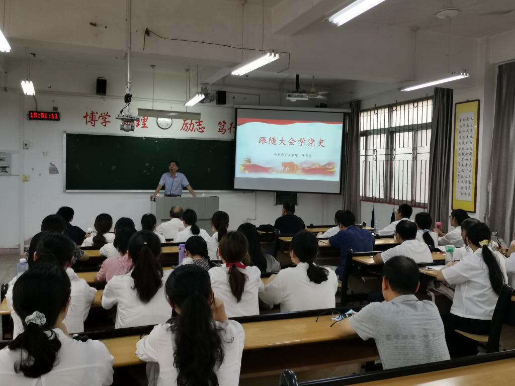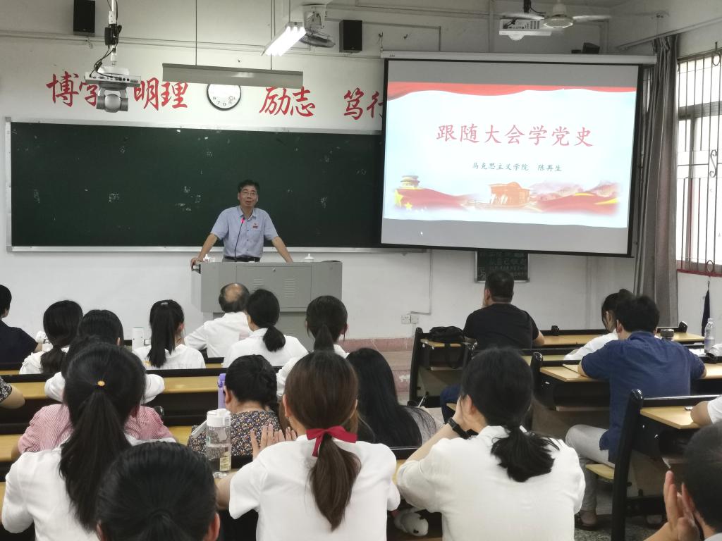 邀请马克思主义学院院长陈再生教授作《跟随大会学党史》专题辅导报告。全体教职工和新入党的学生党员参加学习,讲座由党委书记赵丽霞主持。