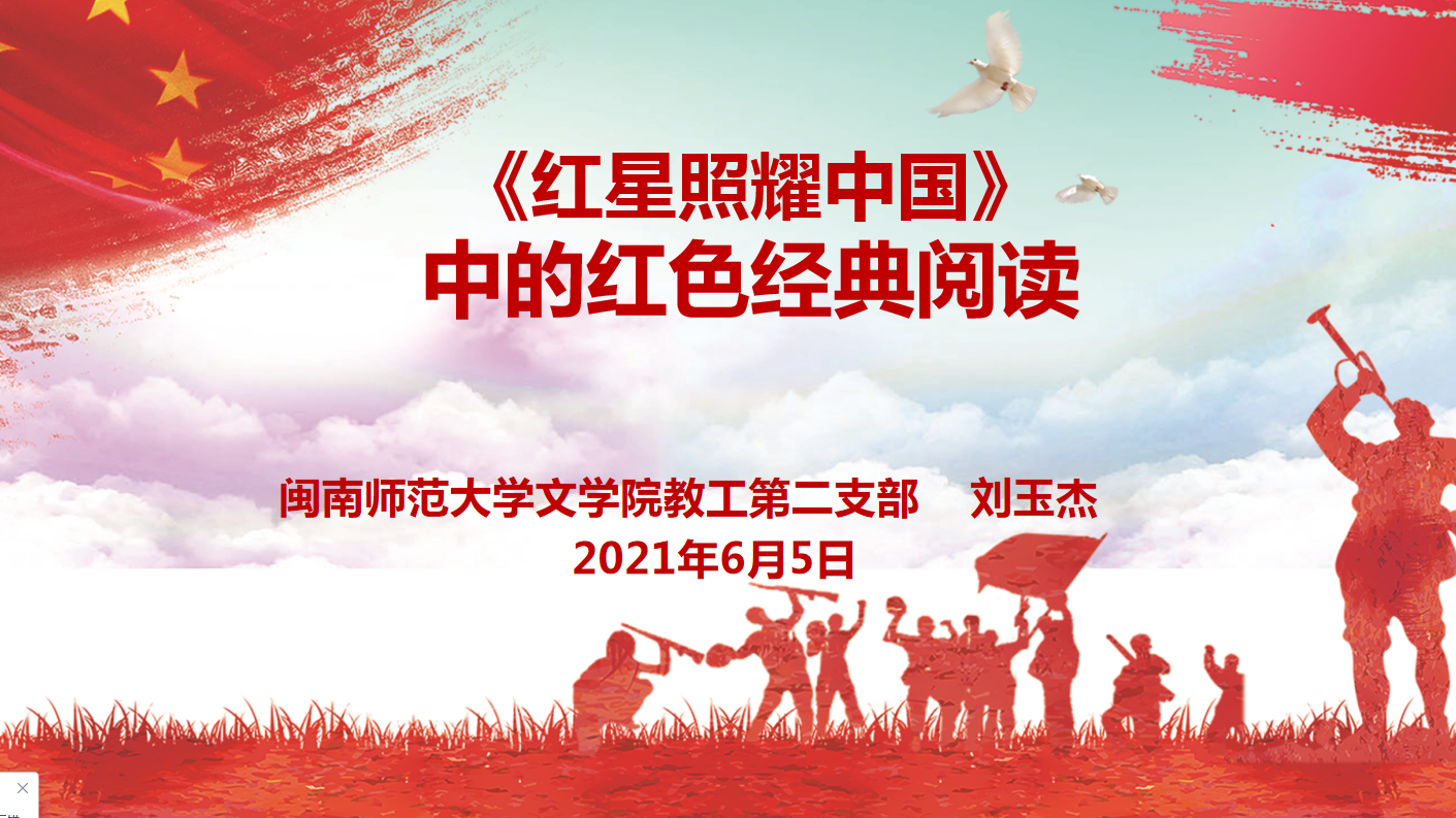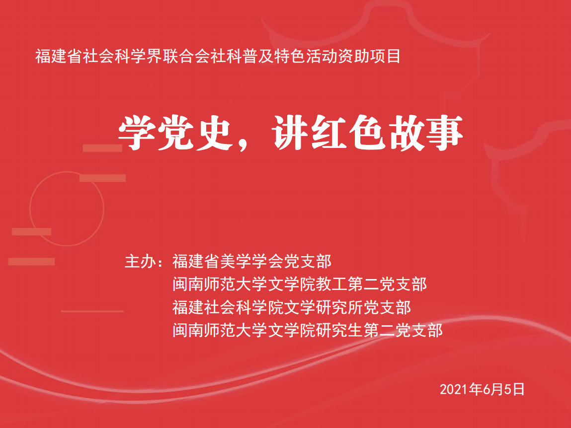 为庆祝中国共产党成立100周年,通过学习党史增强对党的认同感和归属感,“学党史,讲红色故事”活动于6月5日晚在漳州宾馆水仙楼玉兰厅顺利举行,本次活动由福建省美学学会党支部、闽南师大天使动漫