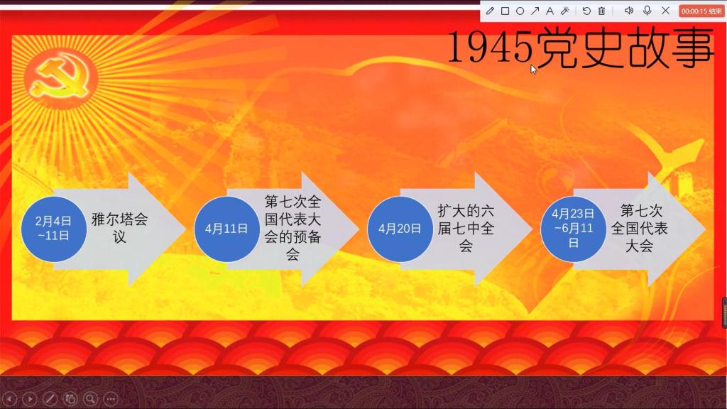 1945年在党史上是极其重要的一年。1945年2月4日至11日,举行了雅尔塔会议。4月11日,中国共产党举行第七次全国代表大会的预备会。4月20日,中共中央扩大的六届七中全会讨论并通过了《关于若干历史问题的决议》。4月23日至6月11日,中国共产党第七次全国代表大会在延安举行。第七次全国代表大会是中国共产党建党以后民主革命时期最重要的一次代表大会,全党在马克思列宁主义、毛泽东思想的基础上达到了空前的团结,为新民主主义革命在全国的胜利奠定了基础。