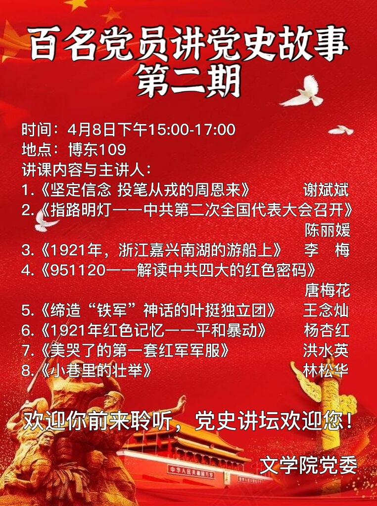 “百名党员讲党史”活动于博东109隆重举行。在本次活动中,谢斌斌、陈丽媛、李梅、唐梅花、洪水英、林松华、杨杏红等老师讲述了1921—1929年的党史故事,党委组织员林枫主持。