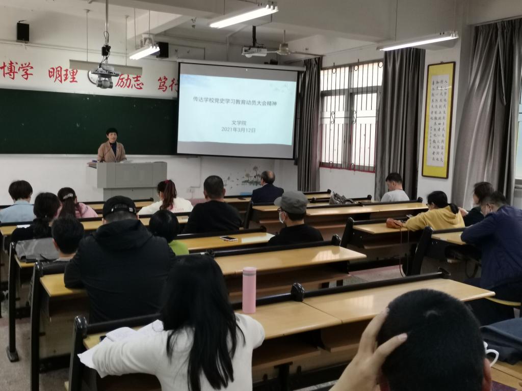 会议伊始,赵丽霞传达了学校党史学习教育动员大会精神。她强调,全党开展党史学习教育,是党中央立足于党的百年历史新起点、统筹中华民族伟大复兴战略全局和世界百年未有之大变局、为动员全党全国满怀信心投身全面建设社会主义现代化国家而作的重大决策。学校党委要求各级党组织把开展党史学习教育作为一项重要的政治任务,广大师生通过学史以明理、学史以增信、学史以崇德、学史更需力行。在汉语言文学专业获得国家级一流本科专业建设点的成绩基础上,推动内涵建设,高质量发展超越,冲刺博士学位授权建设目标,新学期开新局,以优异成绩迎接建党一百周年。