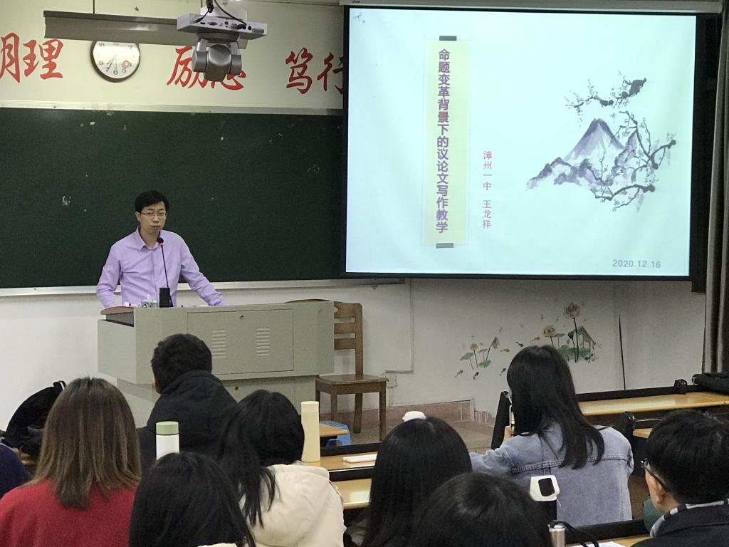 邀请漳州一中王龙祥副教授,在博东109教室开展题为“命题变革背景下的议论文写作教学”的主题讲座。讲座由代顺丽教授主持,2020级教育硕士参加。