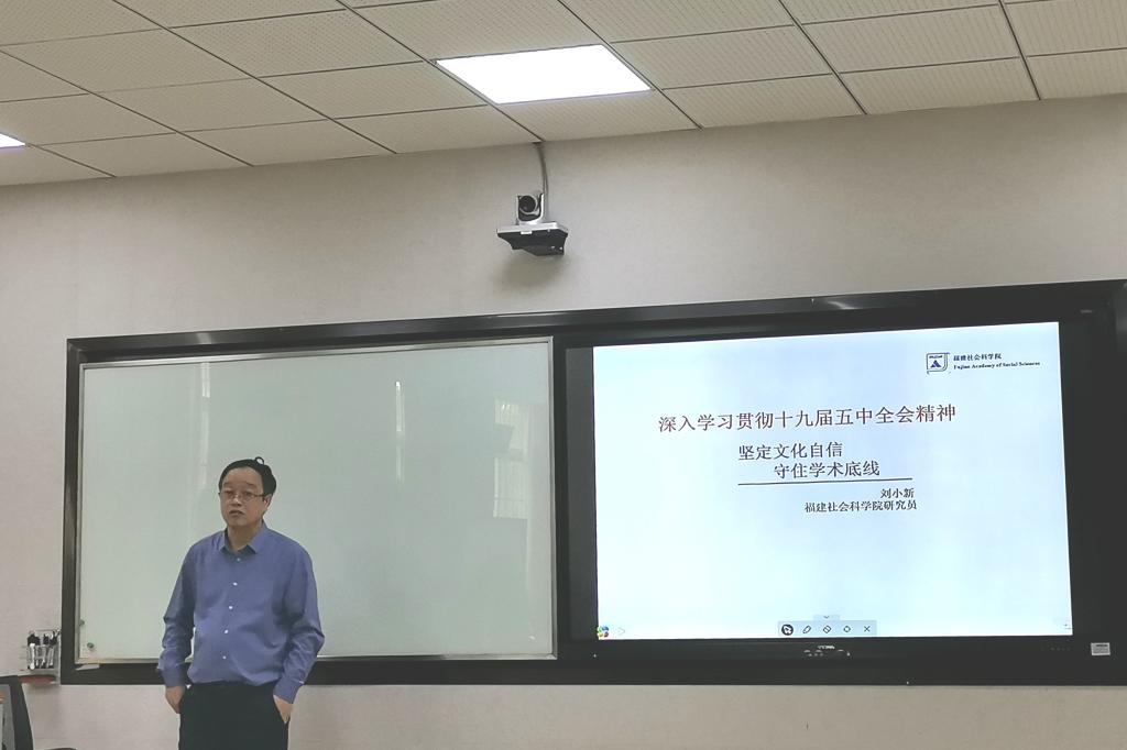 讲座以刘小新先生结合十九届五中全会精神简要谈了“文化自信”这一主题,并展示三张图表揭示了“文化自信”这一关键词于2018年达到了论文发表最高点的现象,表明“文化自信”愈来愈成为学术研究的焦点。刘小新研究员围绕“文化自信”这一中心,首先简要梳理了习近平总书记文化自信论述的提出,让我们对“文化自信”这一概念的继承与发展有了全面的了解。其次,刘研究员又结合自身的理解阐明了文化自信的内涵和意义,分别向同学们讲述了“文化自信”的含义、作用与意义、来源与底气这三大方面。紧接着,围绕着“文化自信”的内涵与意义,刘研究员又提出了“文化自信”的构成,主要包括五个部分:文化主体性、理性精神、文化认同、文化能力、理想信念,其中刘研究员着重讲解了文化能力与理想信念对“文化”自信的重要性。再次,刘研究员还提出研究者应该增强文化自信,自觉抵制各种错误思潮,如历史虚无主义、价值虚无主义等等。最后,刘研究员结合实例给我们讲解了如何坚定文化自信,守住学术底线,他从南渡诗学问题的研究一例告诫我们要守好意识形态底线,从刘小枫的“全球史”与人文政治教育的危机一例告诫我们要守住学术底线,总而言之,刘小新研究员提出做学术研究时要建立好横纵两个坐标轴,要尽量多阅览各方面的资料,要将所研究的问题置于现代社会的环境中去产生碰撞。