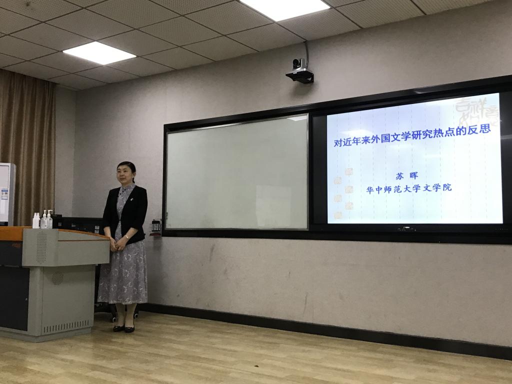 讲座伊始,苏晖教授给同学们分析了近年来外国文学研究的热点问题,通过举例分析七种期刊近五年部分最具影响力的论文,强调以下三个观点:一是诺奖作家作品是研究热点,二是女性作家和少数族裔作家经常受到关注,三是叙事类、文学伦理学批评、生态批评、女性主义批评及跨学科研究是运用较多的批评方法和视角。其次,苏教授还带领同学们对外国文学研究现状进行了反思,启示我们应避免出现跟风和扎堆现象,重视加强经典重释和非英语文学的研究。同时也要克服研究中的模式化倾向,将理论视域向纵深拓展以及避免对于西方价值观的盲目追捧。最后,苏教授还从外国文学研究的中国视角与中国立场提醒同学们要处理好主体性与开放性、选择性与包容性之间的关系,既要充分发挥中国学者的主体意识,又要以开放的胸怀和兼收并蓄的态度摄取丰富的外国文学资源,既不能固步自封、自说自话,也不能盲目追随、失去本位,而是应通过平等的对话与交流,探索世界文学的发展规律,发展本民族的文学和文化。