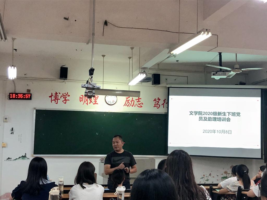 10月8日下午,迎新动员会在博东109召开。学院党委副书记谢斌斌、团委副书记黄小乐、全体辅导员、20级各班代班、班助以及主要学生干部参加了本次动员会。会上,黄小乐详细介绍2020级本科生迎新工作方案,布置人员分工,志愿者工作职责,物资准备,现场调度和注意事项等内容。谢斌斌强调迎新工作重点,要求各学生组织,各班级在工作中必须坚守岗位、热情服务、树立并维护良好形象,通过迎新志愿服务给新同学上好生动“第一课”。随后,黄小乐给下班党员培训,从如何做四讲四有的合格党员,要求下班党员要帮助2020级新同学“扣好人生第一颗纽扣”。