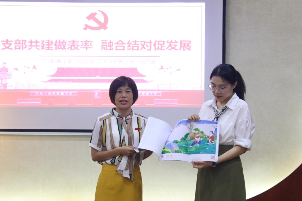 教工第三党支部支委洪水英老师展示了刘闽彦、黄艳惠老师的文字编辑,以及艺术学院陈慧敏、朱俊盈、刘曼丽等老师完成的绘本初稿,分享了“闽南童谣绘本创作”的新思想、新布局,呼吁双方师资提供智力支持,进一步推动了支部融合结对。天使动漫