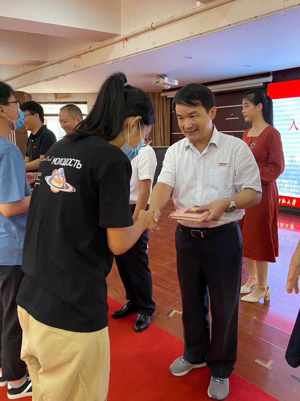 开学典礼特别设置“入学式”环节。现场铺设红地毯,每位同学一个“入学礼包”,里面有校徽、研究生证和时光笔记。辅导员在现场进行第一次点名,同学们依次上台,从师长的手中接过“入学礼包”,正式加入天使动漫