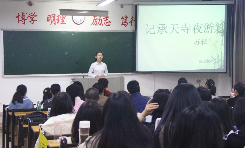 比赛分为个人VCR介绍和十分钟片段教学两部分。选手首先通过VCR介绍让评委、老师及现场观众对其教学准备有初步的了解。接着进行片段教学,每位选手选取中小学课文进行十分钟现场授课。各选手利用PPT展示、视频播放等新媒体手段开展教学,各具风格,氛围轻松,展示了较为扎实的教学基本功以及个性化的教学方法。赛后,黄志勇从品读字词、文本解读、教学设计与个性以及学生思维等方面对现场十位选手进行点评,肯定优点,指明不足,指导选手不断提升教学水平。经过激烈角逐,覃钰以《钱塘湖春行》教学获一等奖,俞盛兰、周颖获二等奖,廖璐瑶、陈煜莹、吕小珍获三等奖。
