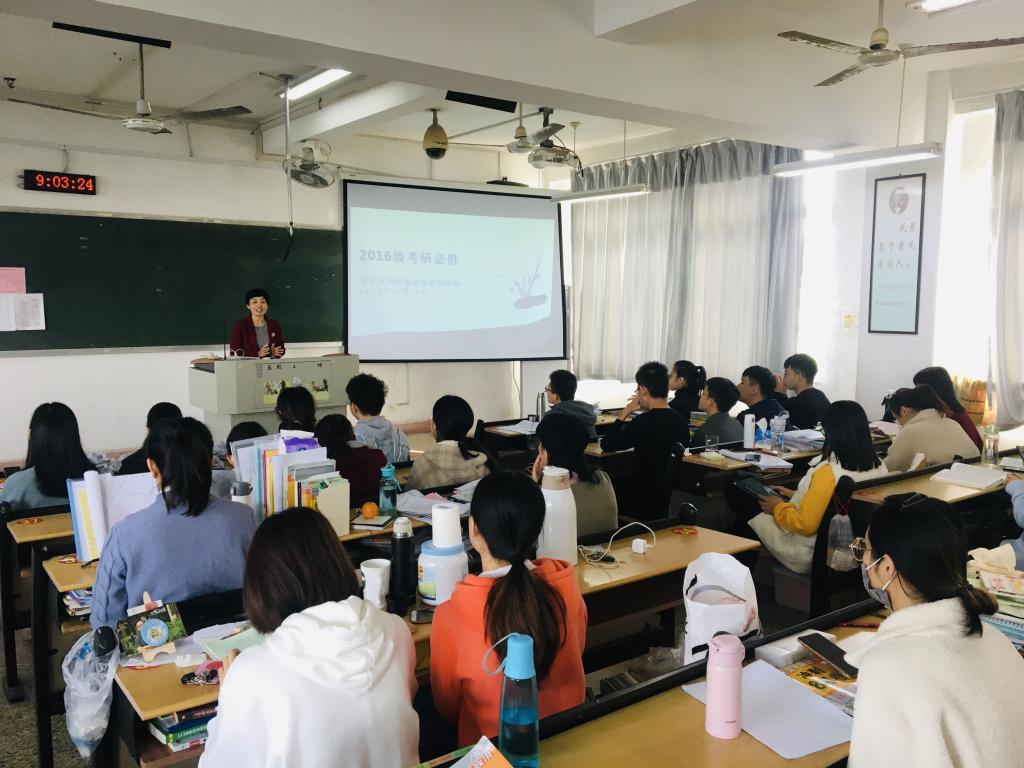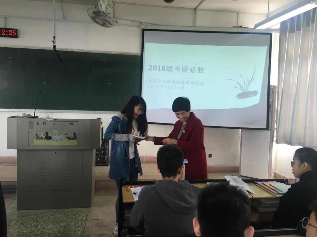 学院党委书记赵丽霞代表班子致辞。她指出,学习改变命运,考研改变人生。“有志者事竟成”,同学们的付出和努力不会白费,一定可以成就更好地自己。她提醒同学们,考研时间临近,要坚定必胜信心,注意调适心情,劳逸结合,以最好状态迎接研究生入学考试。随后,领导和老师亲手将礼物和祝福卡送到考研学生手中,预祝大家金榜题名。