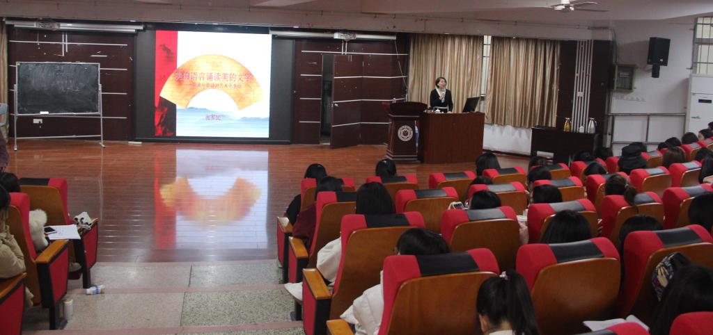 特邀厦门理工学院张军民教授在博西梯一开展主题为“美的语言诵读美的文字”主题讲座。讲座由肖模艳老师主持,18级全体学生到场聆听。