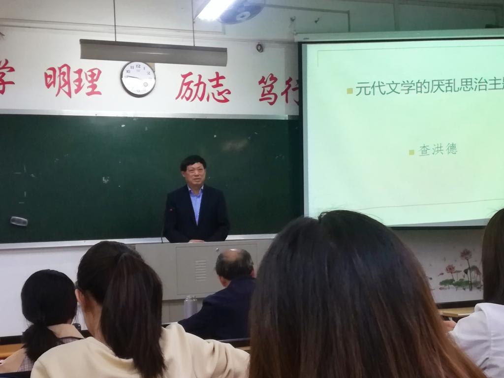 讲座中,查教授首先从“元代文人地位低下”和“《南吕•一枝花•不伏老》是关汉卿自我形象”这两个传统教材中固有的观念切入,提醒师生不能尽信流行的说法,而要建立善思善读善问的学习体系,并通过具体材料论述元代在中国历史上重要影响。接着指出“厌乱思治”是中国文学一以贯之的重要主题,进一步从元代各体文学中举例说明,在元代这一乱世中,反封建、反传统这一传统的元代文学主题论断不符合元代文学的实际。元代文学的基本精神是追求基本道德与社会秩序的重建。