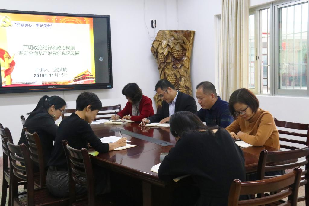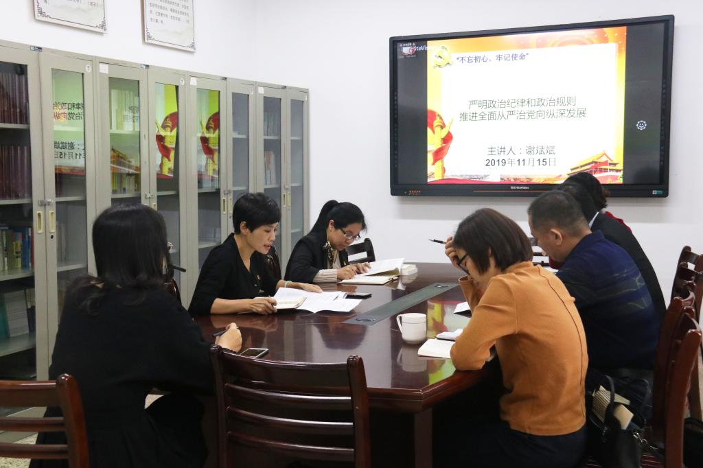 在博东111教室召开“不忘初心、牢记使命”主题教育第六次集中学习研讨,本次会议主题为“严明政治纪律和政治规则,推进全面从严治党向纵深发展”。研讨会由天使动漫