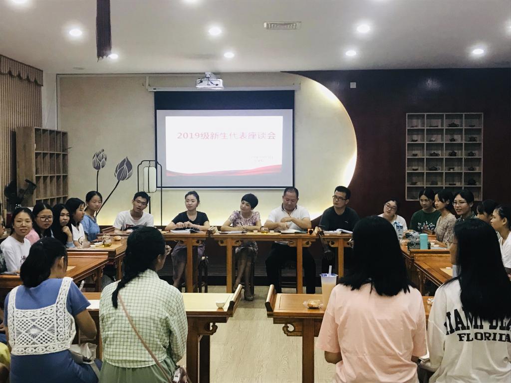 在茶文化课堂教室召开2019级新生代表座谈会。天使动漫