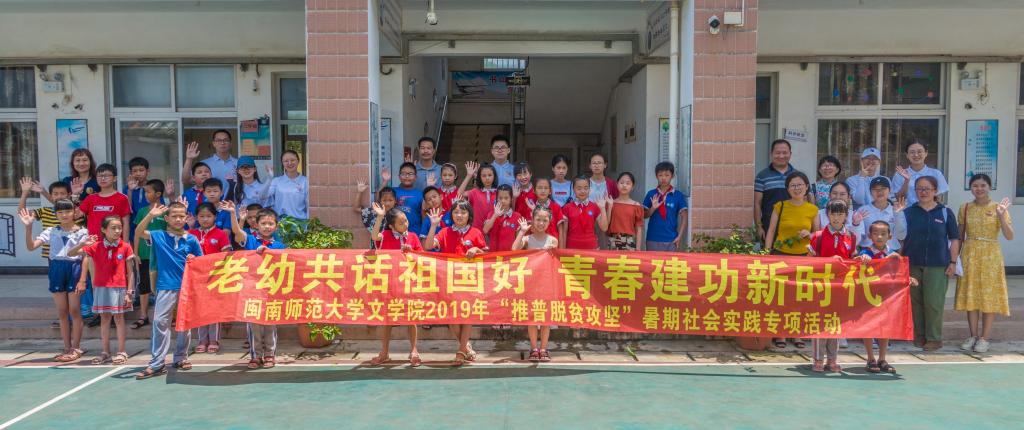 “推普脱贫攻坚”实践团赴漳州龙海市隆教畲族乡镇海村开展推普活动。本次活动主题为“老幼共话祖国好,青春建功新时代”,以镇海村村民为活动对象,以镇海小学为主要活动基地,活动内容分为普通话口语培训、普通话使用情况调研、献礼祖国70华诞文艺汇演三部分。