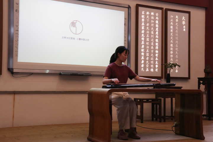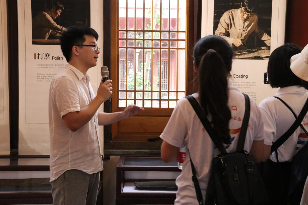 泠音琴社社员赖雪柠分别弹奏《酒狂》与《关山月》,引导大家在一弦一弄中感受古琴文化的意蕴。实践团随后参观古琴制作展示厅,详细了解了选材、定型、琴面、槽腹、合琴、配件、灰胎、打磨、定徽、安足、面漆、上弦等十二道斫琴工序。在百琴堂,各名家与龙人古琴创始人谢建东先生共同斫制的古琴庄严陈列,仿佛在无声的赞叹着古典内涵与时代潮流的完美交融。在滕派蝶画馆,琳琅满目的画作则体现了精美的蝴蝶画与古琴相融的巧妙心思。最后,实践团队走进了国内领先的古琴制作工坊——龙人斫琴坊,一一观摩了十二道工序的实际制作过程。