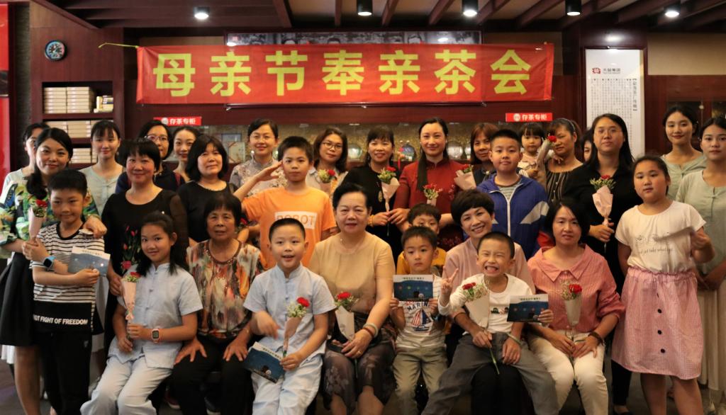 “朗朗读书班”的少儿们围坐嬉笑,迫不及待地端起茶杯奉给亲爱的妈妈。“举杯齐眉高,弯腰鞠真礼”,小茶人在云水茶协成员的指导下专注地投入奉亲仪式,递出祝福,传出真爱。