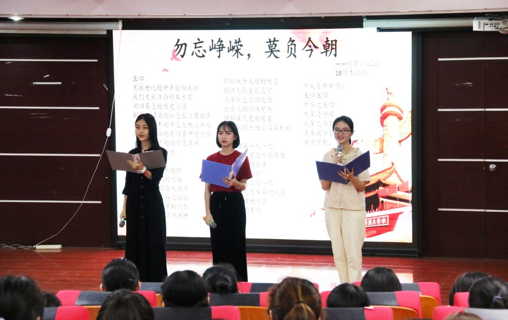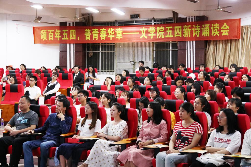 诵读会以班级为单位进行。各班集体倾情朗诵,带领观众回忆往昔:时逾百年,“五四”精神依旧生辉。“甘愿征战血染衣,不平倭寇势不休。”17师本3班与17汉语3班的同学声情并茂地歌颂着抗日民族女英雄李林的爱国事迹。那一份炽热的赤子之心,点照的是祖国的万里山河,扬起的是满腔的爱国情怀。随后,18师本1班、17国际班和17汉语1班赞美校园的诗情画意,松州路上的木棉花,似是踏着飞羽而来,拨动了在场观众的心。最后,由芝山剧社主诵部成员诵读《新诗四首》,鼓舞新时代青年不忘初心,吹响时代的号角,为整场活动画上了圆满的句号。