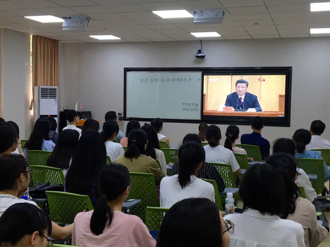 党委组织部分教工党员与在校学生团员、党员观看纪念“五四”运动100周年大会直播。