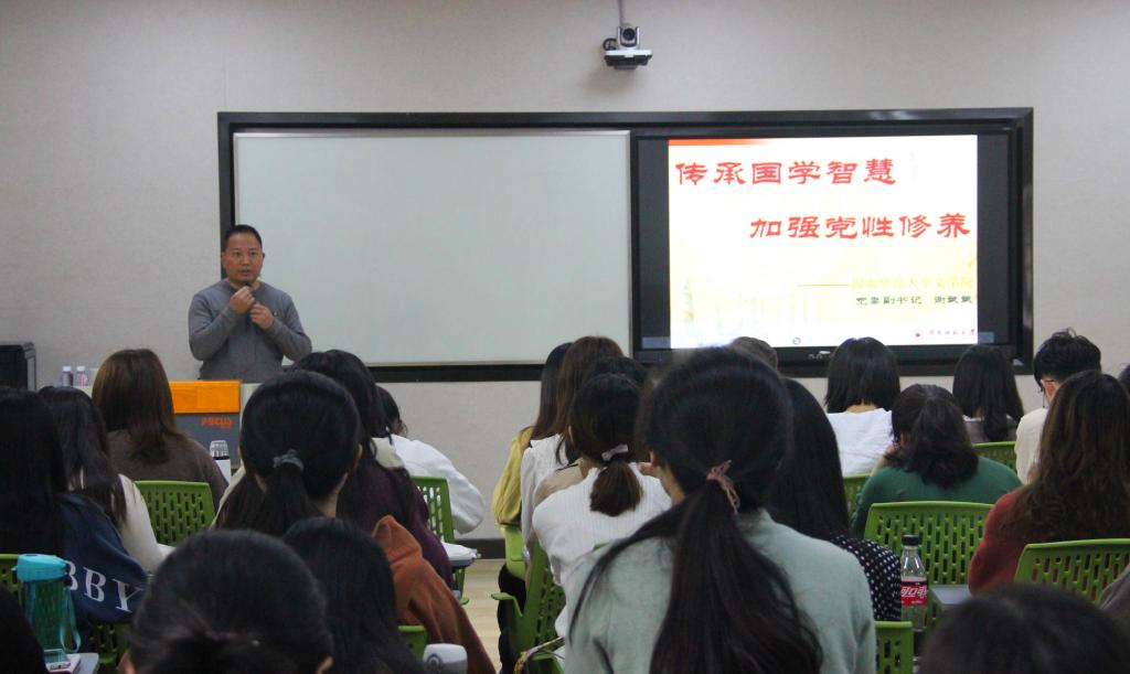谢斌斌引用习近平用典的例子,讲述国学的智慧和学习国学的重要性。中国传统文化教大家怎样做人、怎样做事的道理,蕴含着“向上向善”的价值导向。作为中文专业的大学生党员,大家要学会辩证对待,取其精华去其糟粕,认真贯彻习近平文化强国的战略思想。谢斌斌提醒大家牢记中国共产党人的初心和使命是为中国人民谋幸福,为中华民族谋复兴。中国梦的本质是国家富强、民族振兴、人民幸福。学生党员在学习党的思想过程中,学会借鉴佛教、道教以及儒学中的政治智慧和自律技巧,以此提升自身的党性修养。最后,他提出遵守新党章,加强党性修养的要求,号召在场党员铭记习总书记的嘱托,做一名“爱国、励志、求真、力行”的大学生。