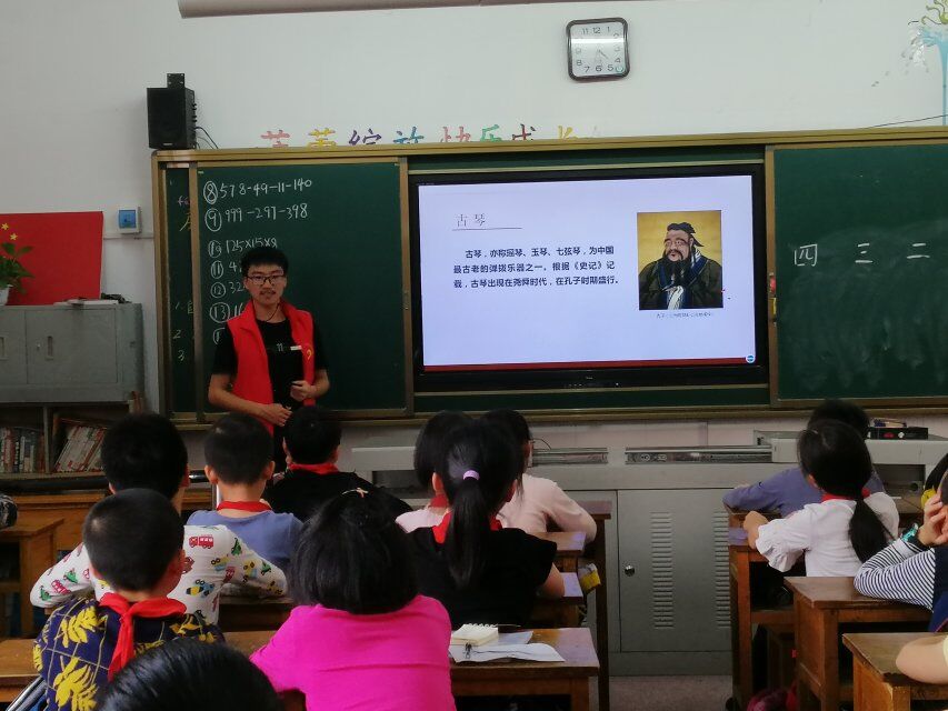 青年志愿者中心带领来自泠音琴社的两名志愿者来到教学地点,开展教学活动。志愿者们用伯牙绝弦的故事作为课堂的引入,然后和小学生们一起进行吟唱教学,把古琴的知识和文化教授给孩子们。志愿者们投身于国学经典文化的传扬中,在教授中明白古典文化的重要性,也让小学生们深入了解优秀古典文化,将国学经典发扬光大。