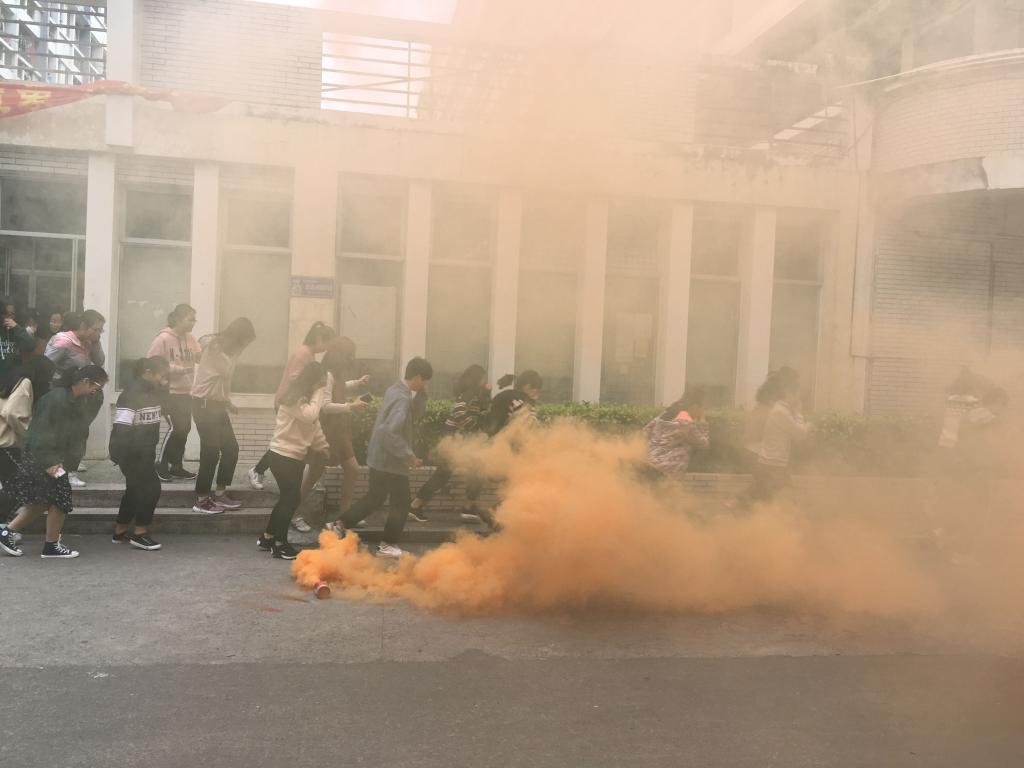 为营造紧急突发的演练氛围,在预定的演练时间段的任意时间点,消防科燃放公寓前后门的烟雾弹,逃生警报响起,2018级全体同学奔出公寓,用湿毛巾捂住口鼻,按照预定逃生路线,从6号宿舍楼迅速、有序撤离至龙江篮球场集合点,立即整队、核查人数。大部队集合总用时3分58秒,最早到达集合点的一批人用时36秒,圆满完成本次疏散任务。