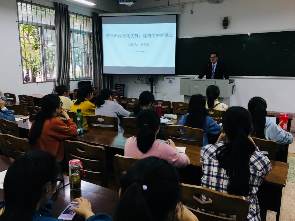 为进一步提升大学生文创思维,加强两岸文化交流,促进文创新模式的借鉴交流与发展,12月6日下午,“结合两岸文化优势,建构文创新模式 ”主题讲座在博东108教室召开。天使动漫