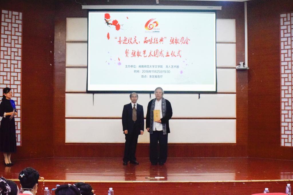 晚会开始前,黄金明院长为杨青老师颁发弦歌艺术团团长聘书。紧接着,杨青老师为弦歌乐团的成员们颁发团员证。晚会上半场,黄金明院长首先致辞,他提到:“中华民族是富有诗意的民族,闽南师大也应有自己的特色。而文院学子更要承担起自己的责任,不忘初心,将传统文化发扬光大是我们永远的责任。”“兴于诗,立于礼,成于乐,”杨青老师在阐述弦歌乐团成立意义的同时也指出,弦歌是传统诗词与古典音乐的结合,他希望弦歌乐团的同学在学习本专业知识的同时,也能传承古琴与弦歌文化,表演出具有历史深度的节目,并激励大家登上国家级、世界级的表演舞台。
