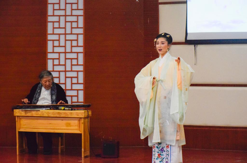 诗词谱成曲,琴韵淡墨痕。杨青老师一曲清亮绵远的《流水》拉开了弦歌晚会的序幕。品经典,琴歌扬。梁雅、张依冉、孙宁等分别演唱《山桃红》《皂罗袍》《步步娇》,三首琴歌将《牡丹亭》瑰丽的爱情故事娓娓道来,声声留情。琴诵诗经,《蒹葭》《鹿鸣》字字生辉。琴梦红楼,一曲凄切哀婉的《枉凝眉》似淙淙溪水,流入观众心底;一首浓烈忧伤的《葬花吟》,句句入心,令人感叹。张锦冰独奏《梅花三弄》,醇和淡雅,刚柔并济。泠泠琴音伴着悠扬的歌声,将《客舍》的朴实好客与《黄鹤楼》的依依别情,演绎得淋漓尽致。