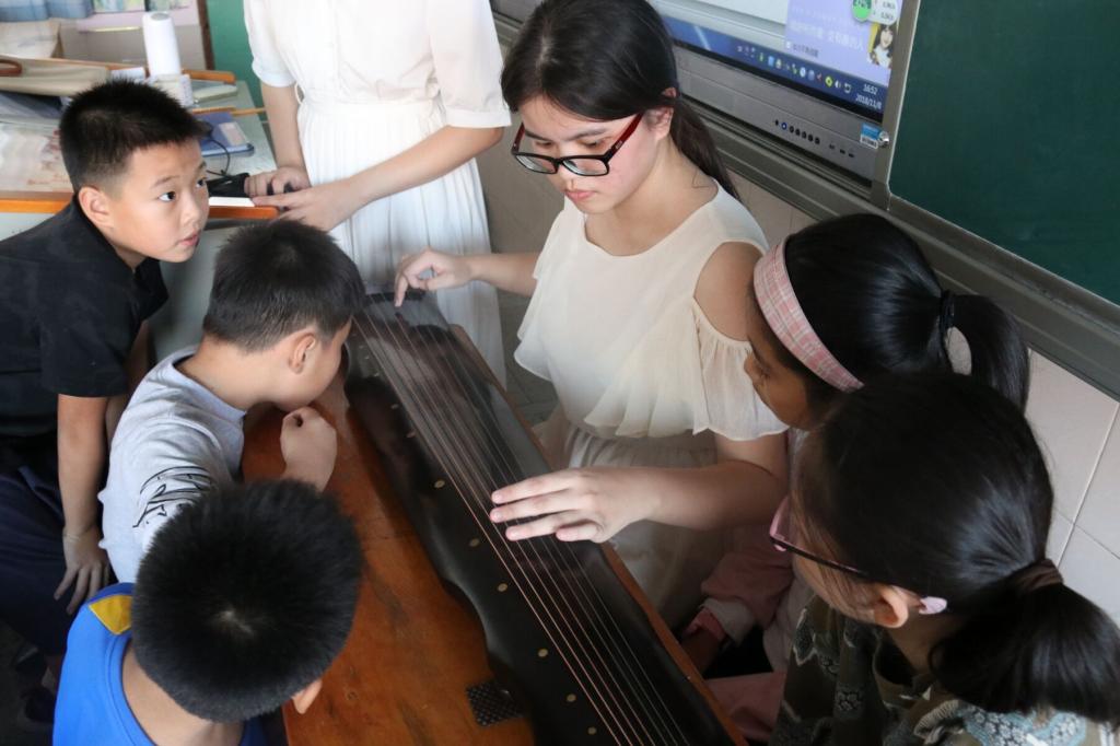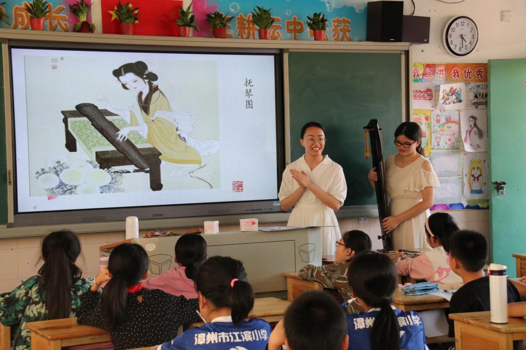 下午16时,国学名画组和国学诗经吟唱组的志愿者们准时来到江滨小学,为上课做准备。名画组的志愿者惟妙惟肖地给同学们讲解了《步辇图》这幅画,此画作是汉藏民族友好团结的历史见证,激发了同学们浓厚的学习兴趣,课堂氛围十分活跃。来自泠音琴社的志愿者首先给诗经吟唱班的同学们进行古琴弹奏,活跃了课堂氛围,接下来介绍古琴的基本知识,并和小朋友们围坐在一起吟唱《小池》,小朋友们兴致勃勃,在欢乐的气氛中学到知识。充当纪律老师的志愿者也通过劝导、提醒的方式维持课堂秩序,课堂秩序井井有条。