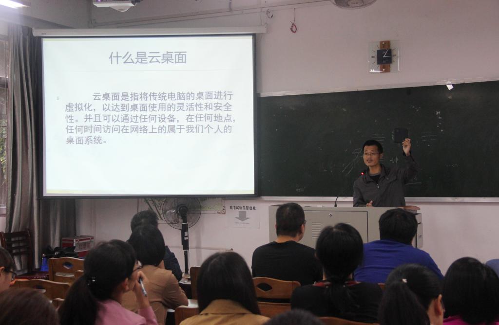 首先,林学聪老师从什么是云桌面、云桌面的登录、账号密码修改、离线模式使用四个方面为在场老师讲解云桌面的构成及使用,初步构建理论框架。随后,林老师通过现场电脑操作与机器向大家形象的展示了云桌面管理和使用操作过程。同时,他强调道,老师们在上课过程中若遇到问题要及时反馈,减少不必要的麻烦。最后,各位老师就在上课使用云桌面时遇到的问题纷纷提问,林老师为大家一一解答。