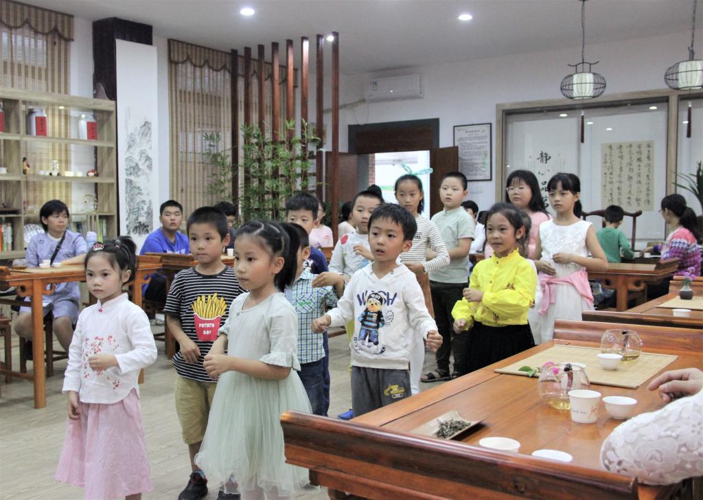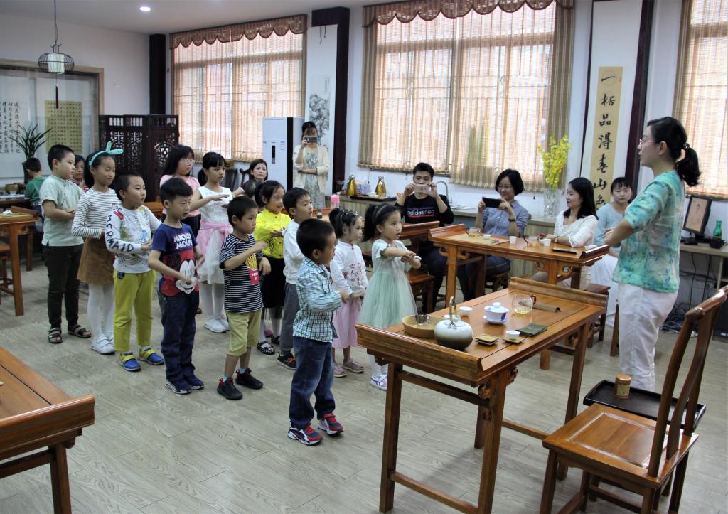 林枫老师还现场带领小朋友们练习了以闽南功夫茶为素材的茶操,在老师的耐心教导下,小茶人们不仅对茶谣朗朗上口,对茶操动作也是练得有模有样。